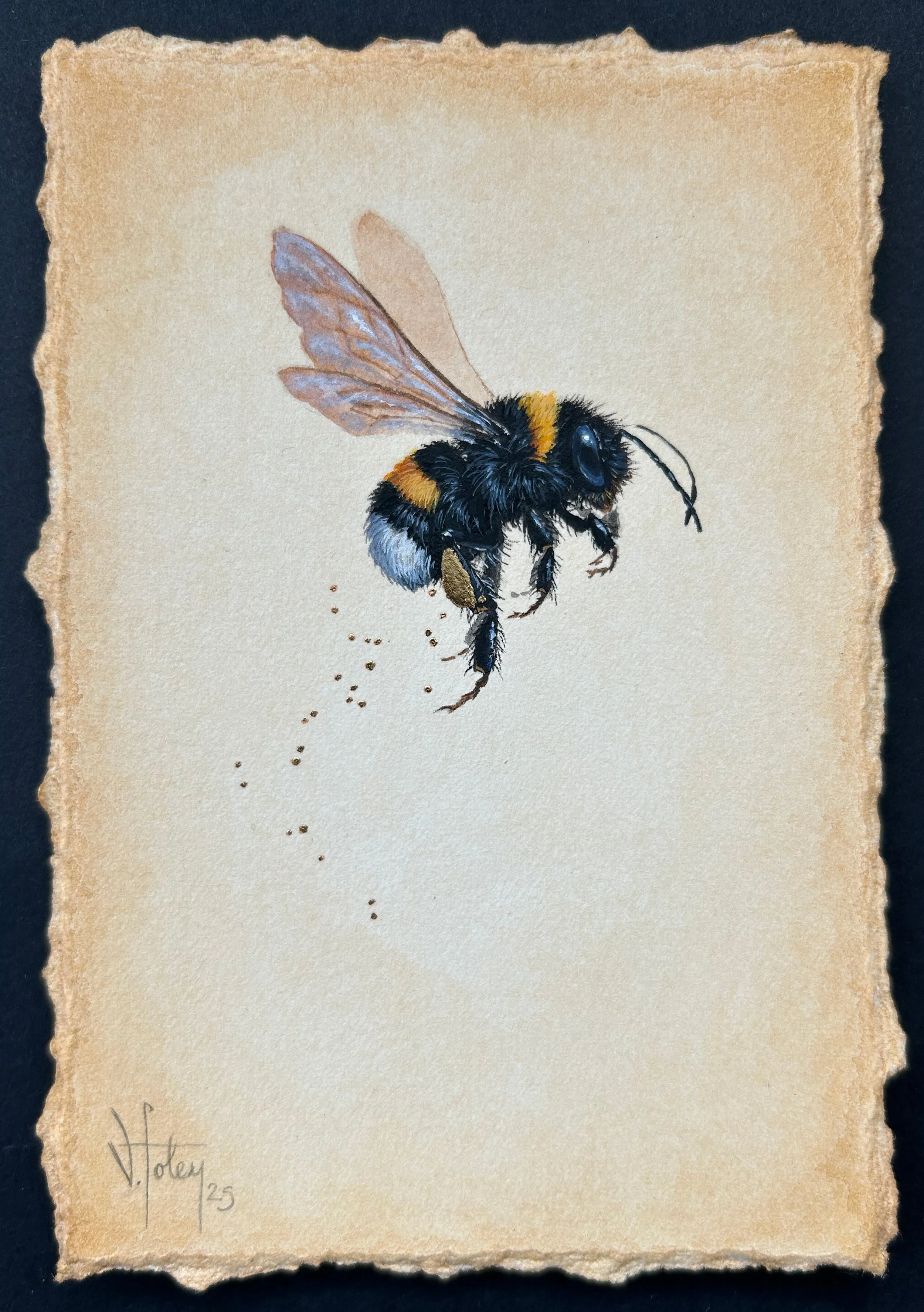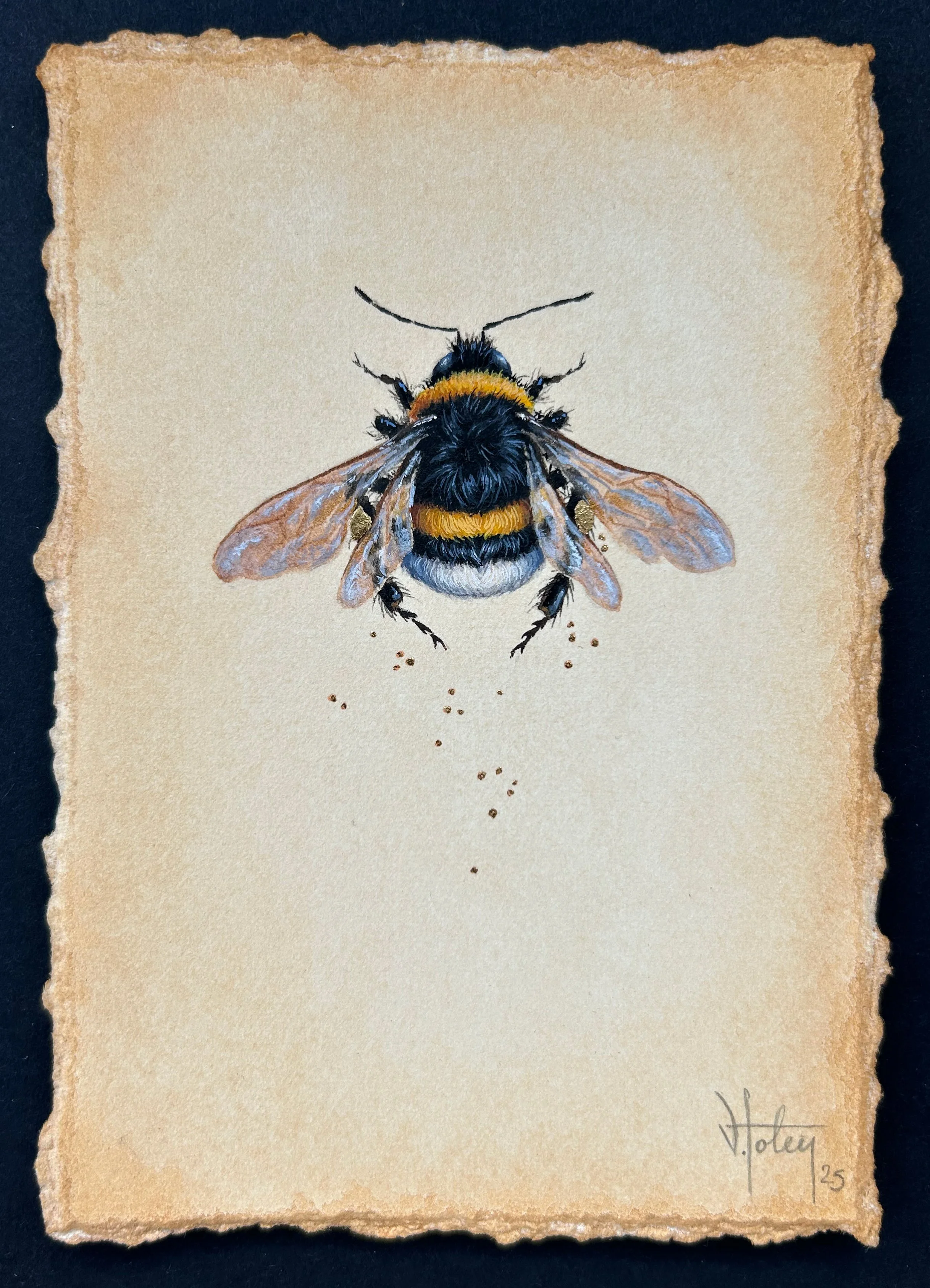 An original painting of one of my precious Buff Tailed Bumblebees on thick cotton, hand-deckled paper. The paper has been aged with a watercolour glaze and then the bumblebee worked on with graphite, watercolour, gouache and I've created the raised pollen dusting with gesso and 24kt gold Leaf.