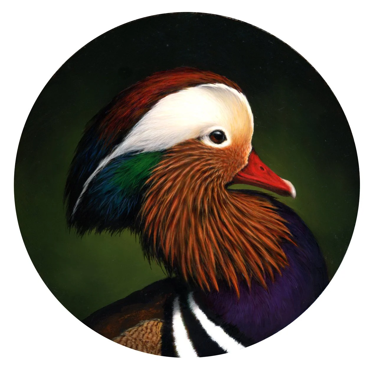 The duck that started it all! This entire miniature duck portrait series came about because I was absolutely desperate to paint this beauty, his amazing feathers and sweet little face were irresistible to my artists eye. I was so happy with how he turned out, especially on the round panel, I decided to make a whole series of these fancy feathered gents.